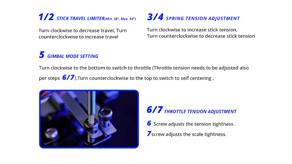 6.様々な調整が可能です:ストローク調整(最大54°、最小38°)、ストレッチ調整、ロッカーモード設定、スロットルフォース調整。