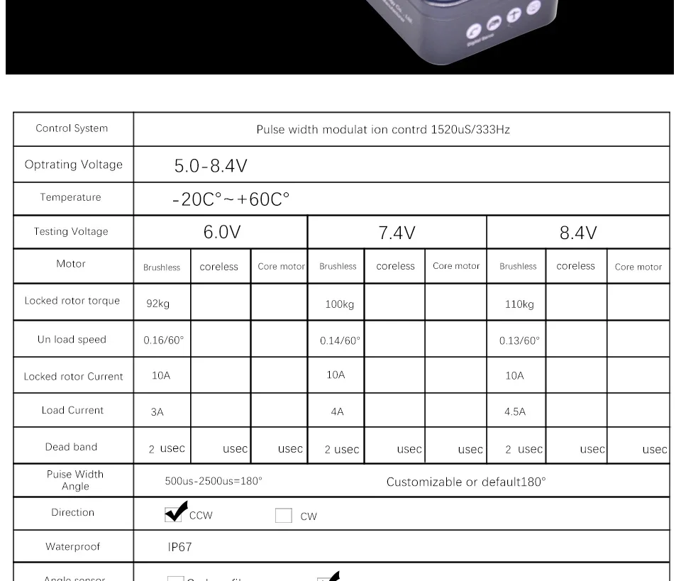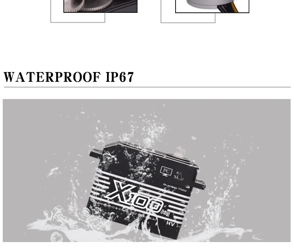 100KG 大トルク デジタル防水 サーボ はブラシレス モーターを採用しています。通常の サーボ と比較して、速度がはるかに速く、反応も高速です。6.0V ~8.4V の高動作電圧範囲。