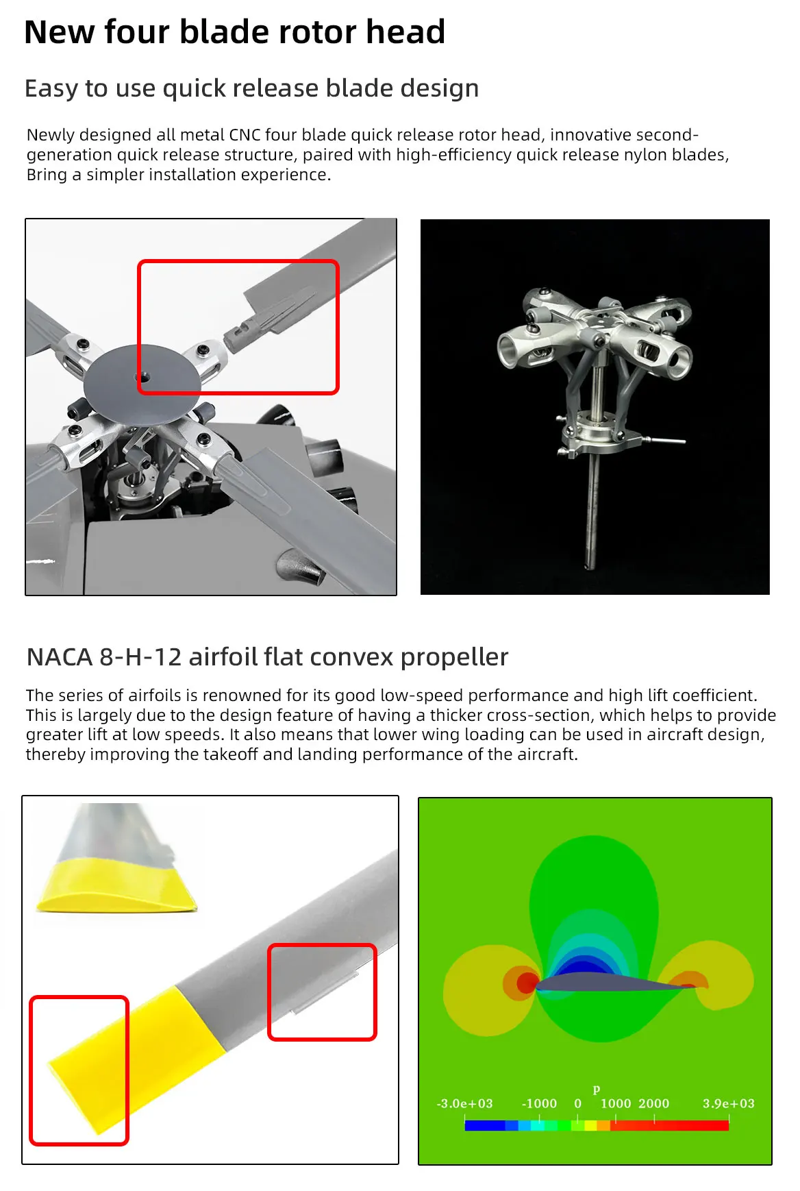 強力な?力源として、16V ブラシレス モーターの組み合わせで60Aのツインワン ESCを搭載し、飛行効率向上を実現。高速な4KG.cm サーボの0.12秒/60の応答はirosikkuの必要を省略します。CNC 4 ブレードの快適な操作性と高効率なクイックリリース ナイロン ブレードは使いやすい設計です。
