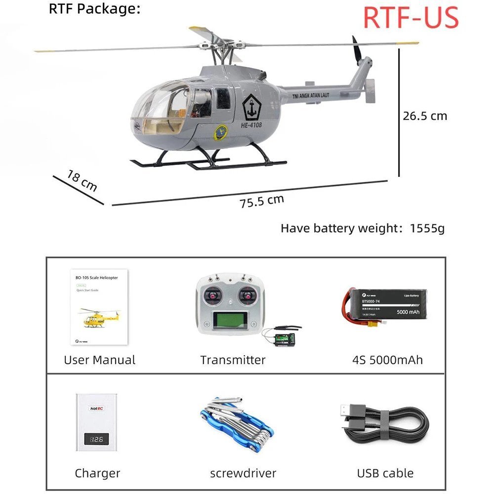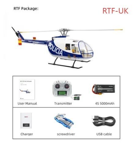 - RTFパッケージ: 主機 + 英語マニュアル + 送信機 + 4S 5000mAh + 充電器 + ドライバー + USBケーブル