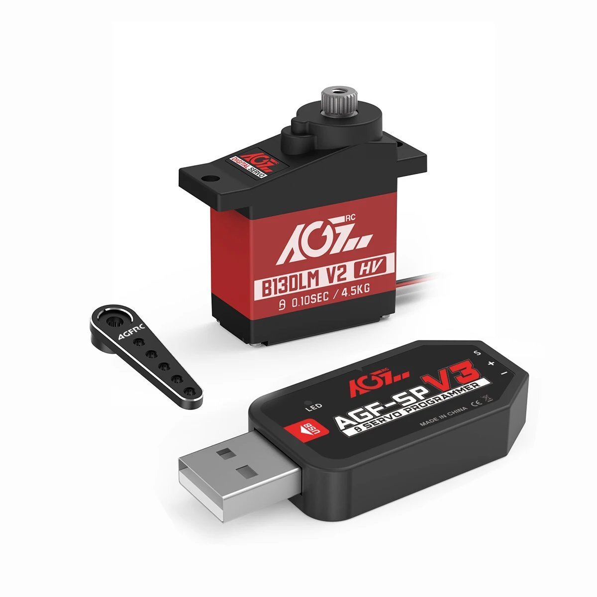 AGFRC B13DLM V2 サーボ は、2S 8.4V 高電圧プログラマブルデジタルマイクロ サーボ です。CNCアルミケースを採用し、優れた放熱性と サーボ 構造の強化を実現しています。ダブルボールベアリング、チタンギア、DCモーターと組み合わせることで、8.4Vで4.5kg-cmの高トルクを実現。軽量・小型設計で、ほとんどのミニR/Cモデルに最適です。さまざまなニーズを満たすために、当社の USB プログラマーを介して サーボ パラメータをプログラムすること。