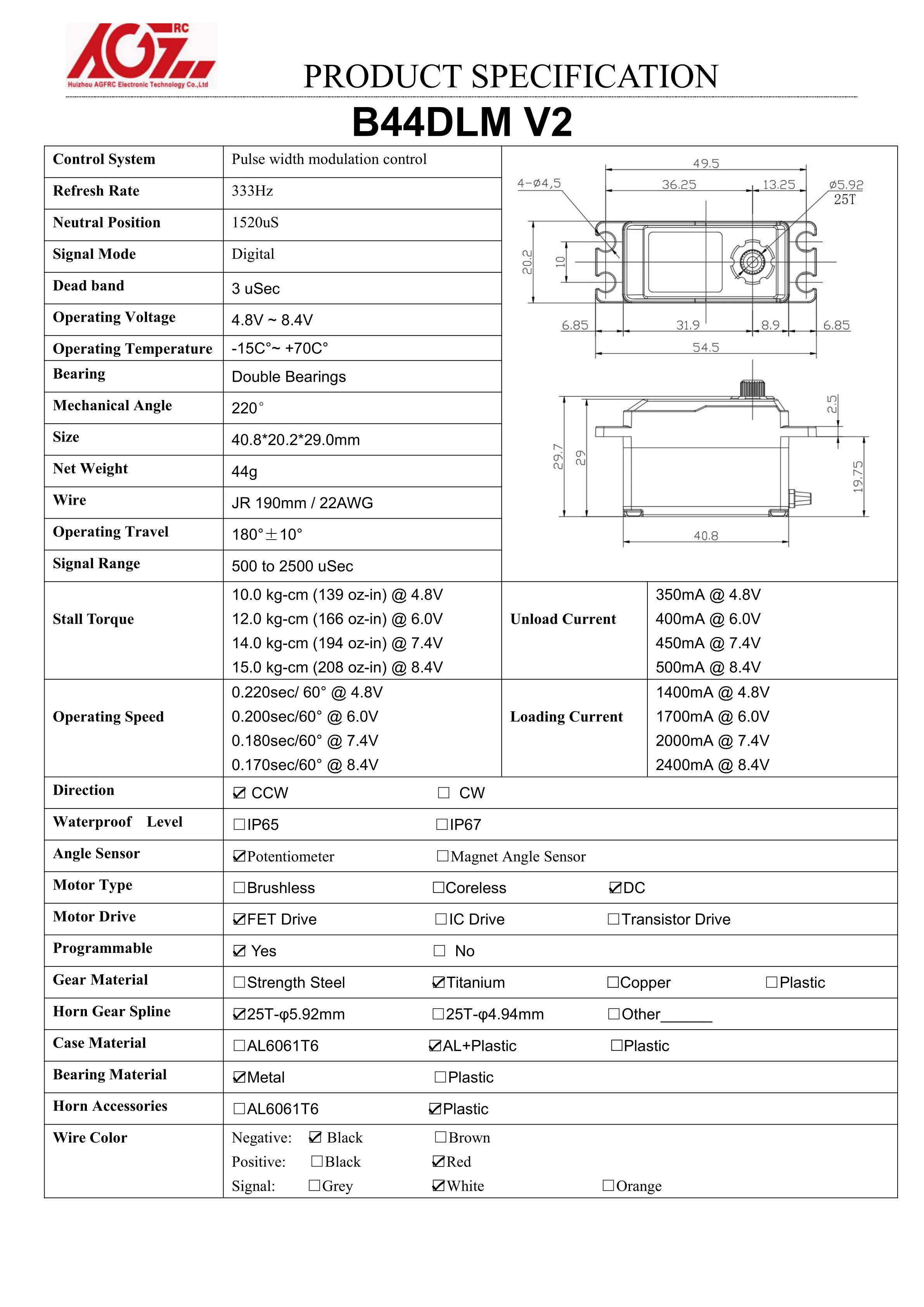 AGFRCの新製品 B44DLM V2 15.0KGトルク お手頃価格のロープロファイル プログラマブルDC サーボ は、プラスチックとCNCケースを採用し、優れた気密性で埃や飛沫を防ぎます。高精度チタンギアと滑らかなデュアルボールベアリングにより、 サーボ の動作は安定し、スムーズな動作を保ちます。 8.4Vの高電圧と0.17秒の速度は、1/10 1/12 ドリフトカー競技ツーリングカーオンロードパンカーなどに最適です。パラメータプログラミングが必要な場合は、AGF-SPV2またはAGF-SPV3プログラミングカードで使用できます。