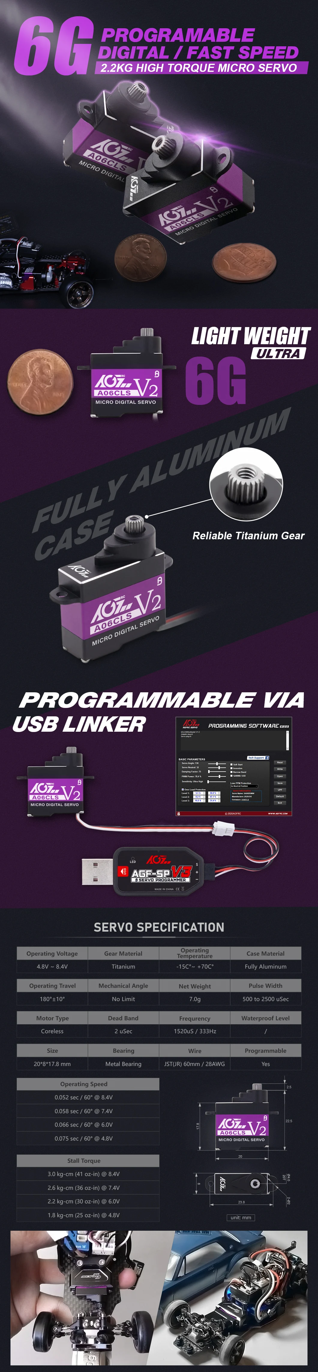 AGFRC A06CLS V2 アルミケース 20T HV 7g チタンギア 3.0KG 0.052秒 超高速プログラマブルマイクロ サーボ ミニカー GLR GLA MRZ 飛行機用