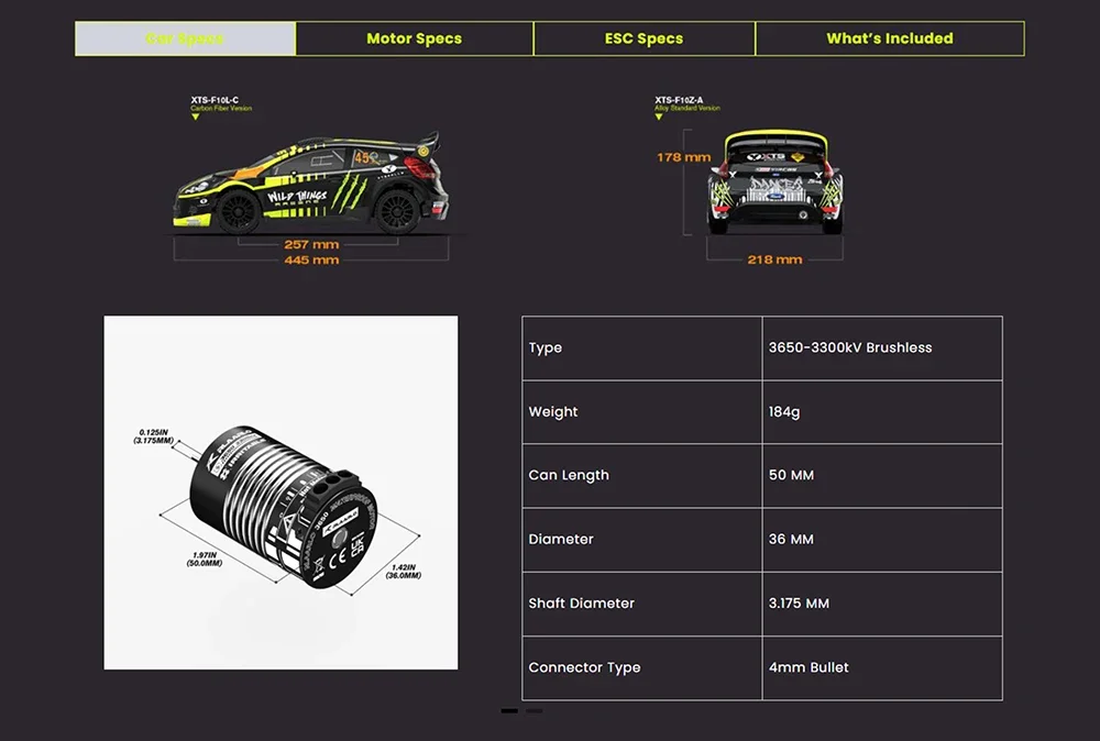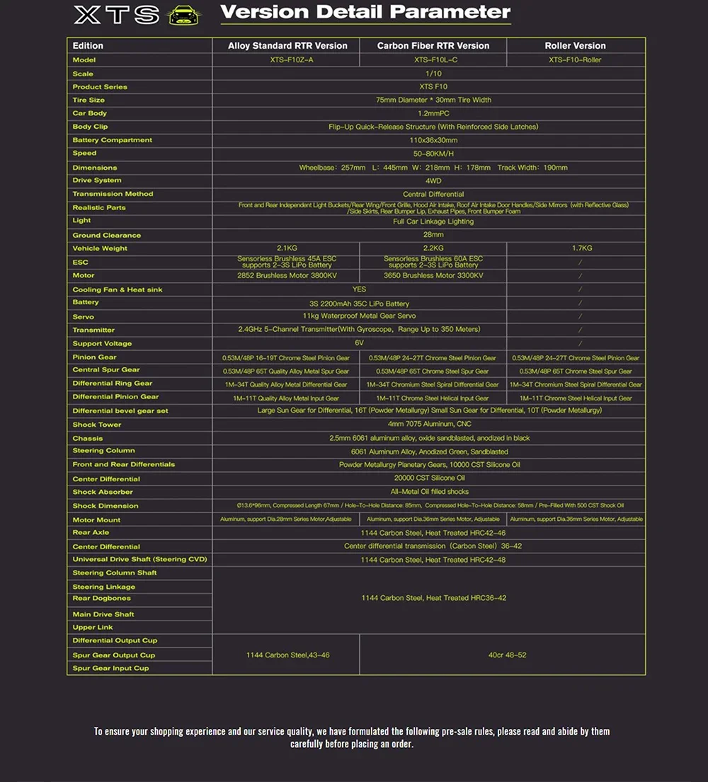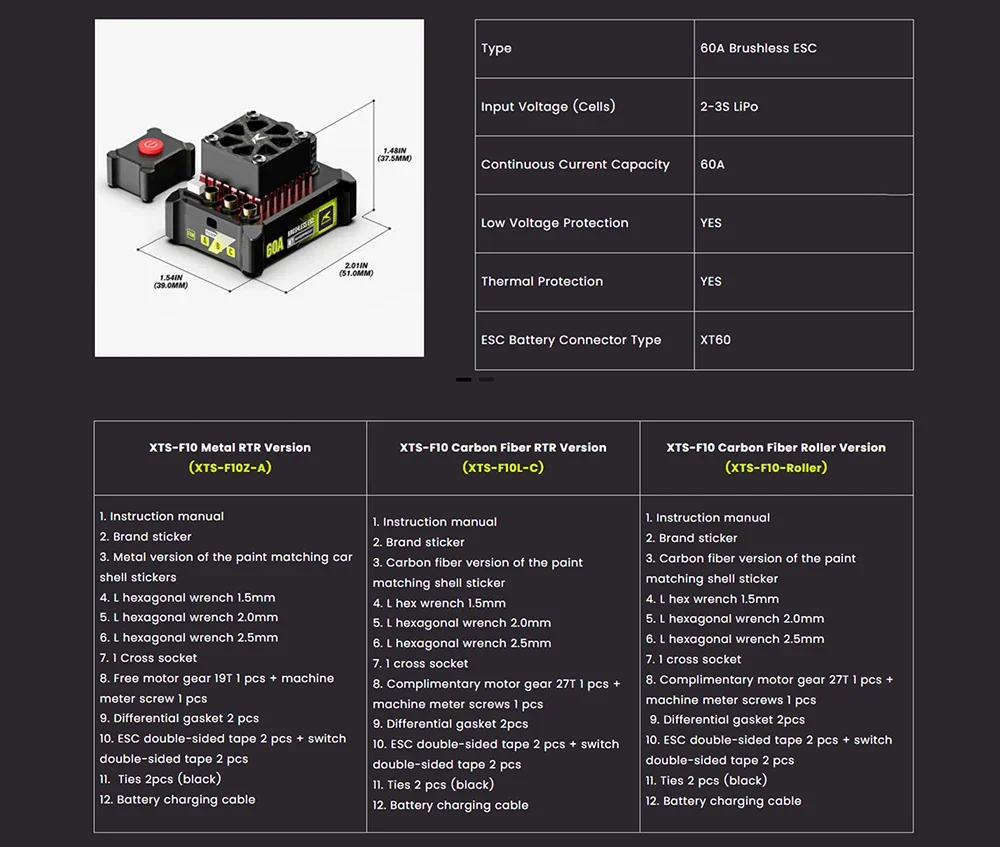カーボンファイバーバージョンRTR:カーボンファイバーシャーシ、60AブラシレスESC、3650 3300KVブラシレスモーター、11KGステアリングサーボ、2.4GHz 5チャンネルリモートコントロール、3S 2200mAh LiPoバッテリー、充電器を装備。