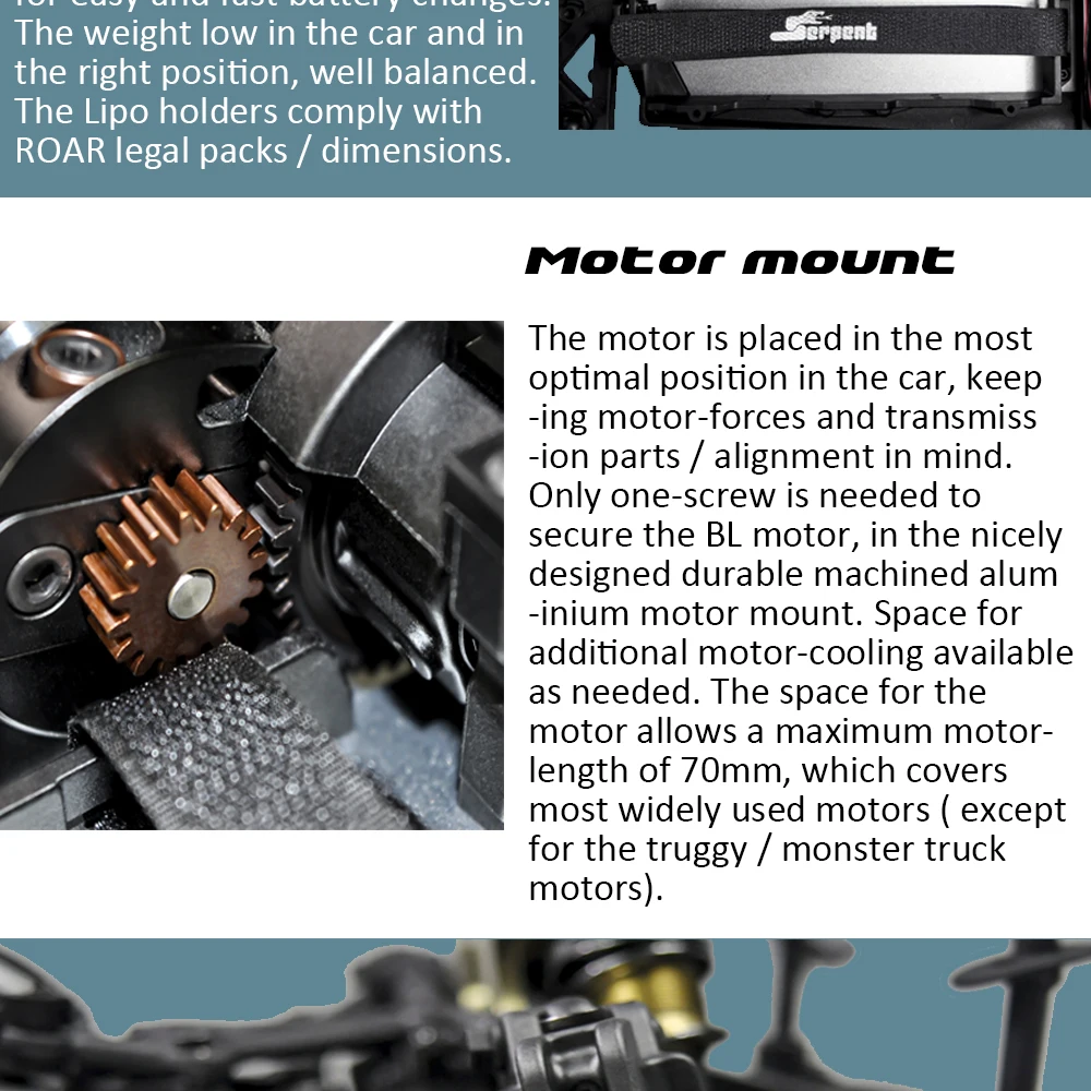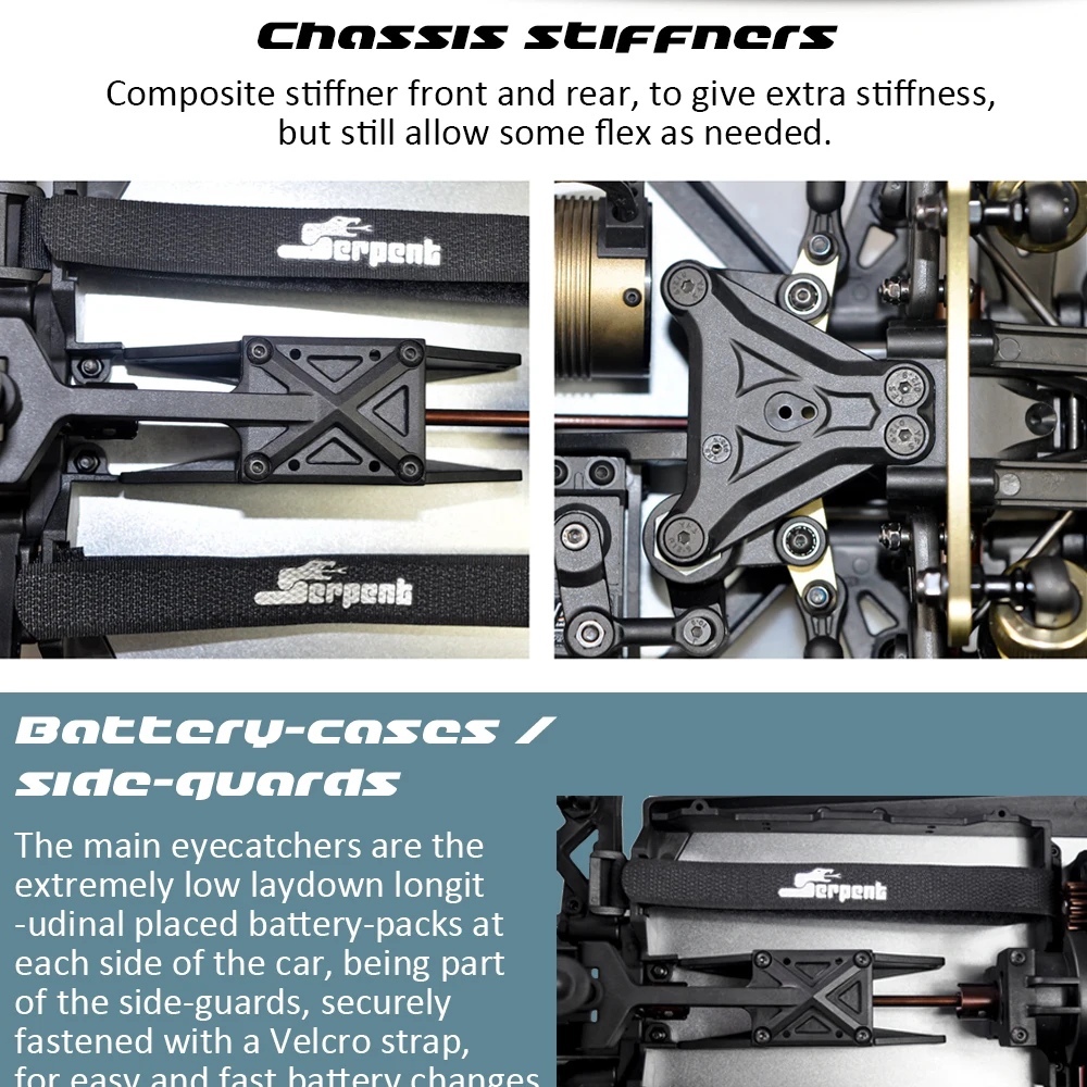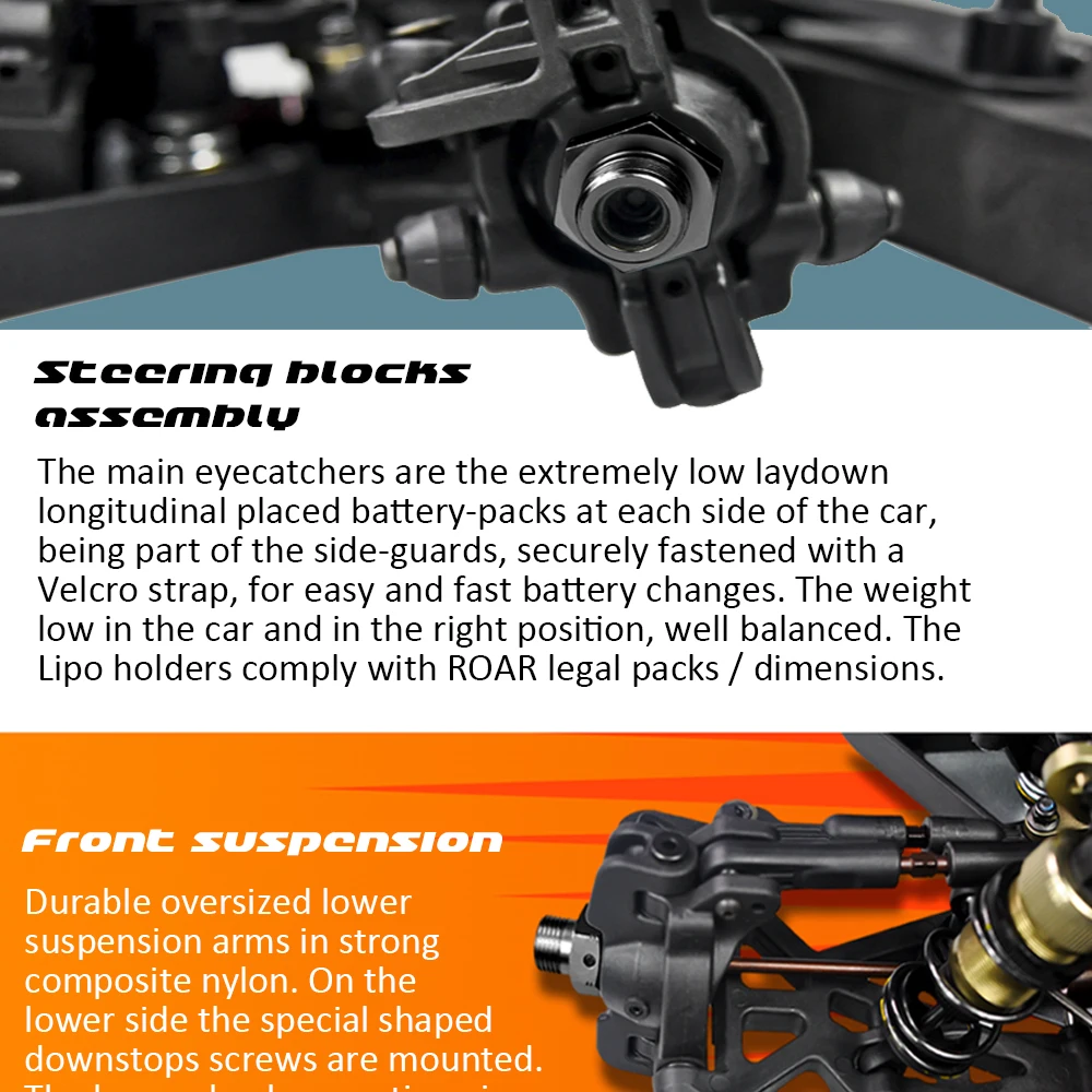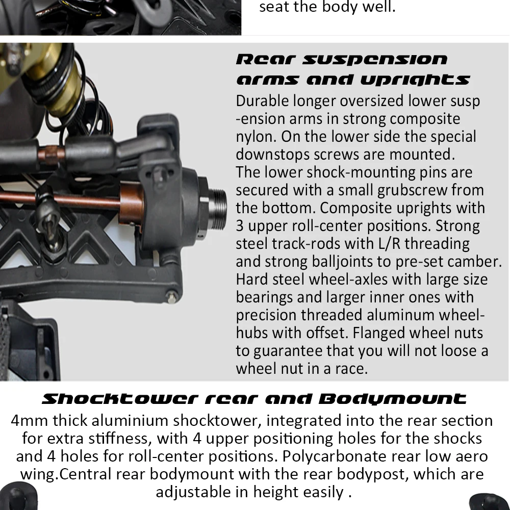 カルダンシャフト付き 4WD、2 つのコンパクトで耐久性のあるギア ディファレンシャル、超簡単な機械加工のアルミニウム モーター マウント、超低縦方向バッテリー ボックス、コンパクトなスピード サーボ マウント、独自の角度付きステアリング システム、16mm ビッグ ボア ショック、ボール レース アンチ ロール バー、FR および RR 6061T6 アルショック タワー、FR および RR 耐久性のあるサスペンションおよびトランスミッション部品、キャプチャされたサスペンション ピン、すべて!!