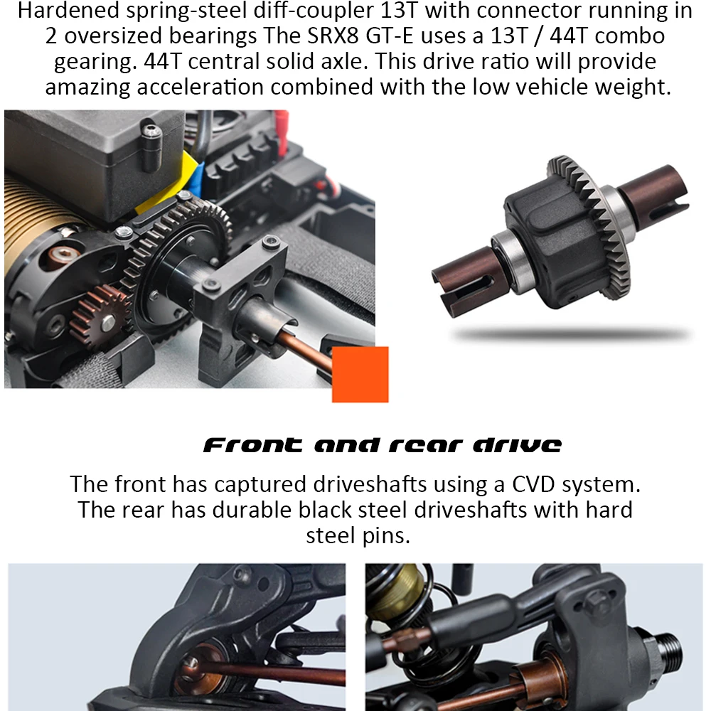 最高品質のコンポーネントを詰め込んだすぐに使えるパッケージで、ホビードライバーにとって最高のスタートを切ることができます。最高品質のパーツを搭載したハイエンドレーシングシャーシ、高性能2.4GHzトランスミッター、SRX8 GTEにぴったりフィットする小型防水電子スピードコントローラー、そして強力なトルクを誇る1900KVブラシレスモーターを搭載しています。