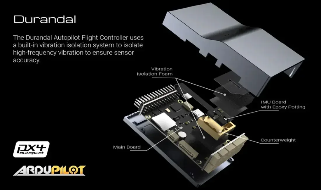 Durandalは、HolybroがSTM32H7マイクロコントローラーシリーズを利用して設計したフライトコントローラーです。振動絶縁システムが内蔵されており、センサーの温度制御用にIMUヒーターが組み込まれています。