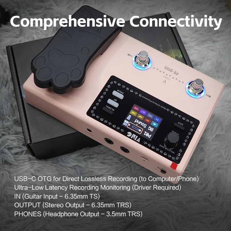 A: FE-200は2イン/2アウトのUSB-Cオーディオインターフェースを内蔵しており、PCやモバイルデバイスと接続して、低レイテンシでのDAWレコーディングやモニタリングが可能です。OTG接続にも対応しています。 - Q: エクスプレッションペダルはどのような機能がありますか?