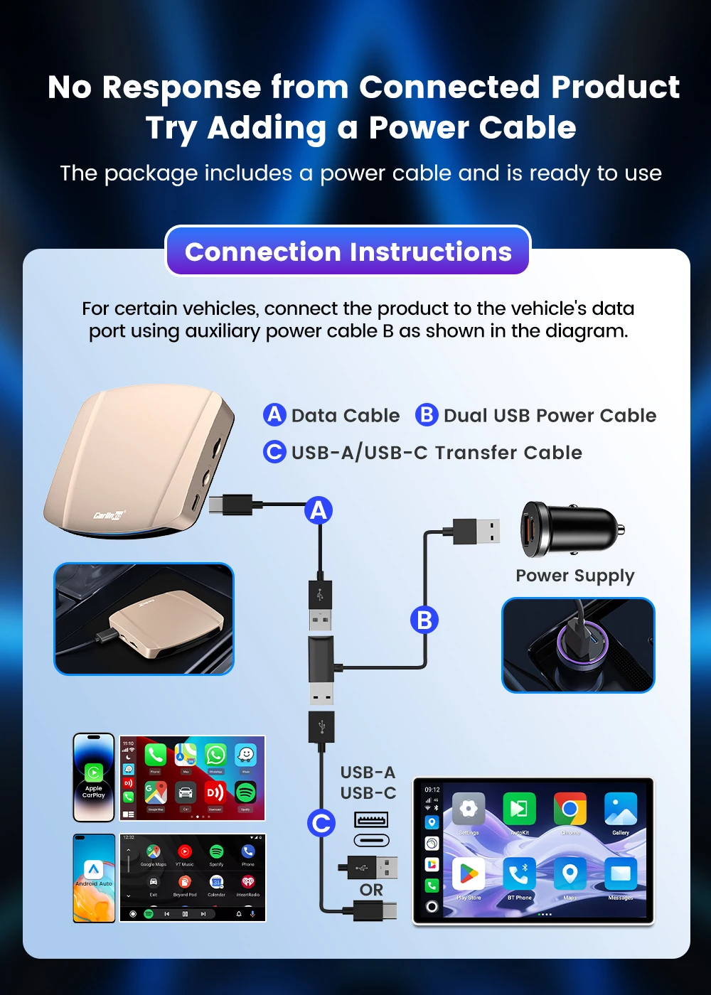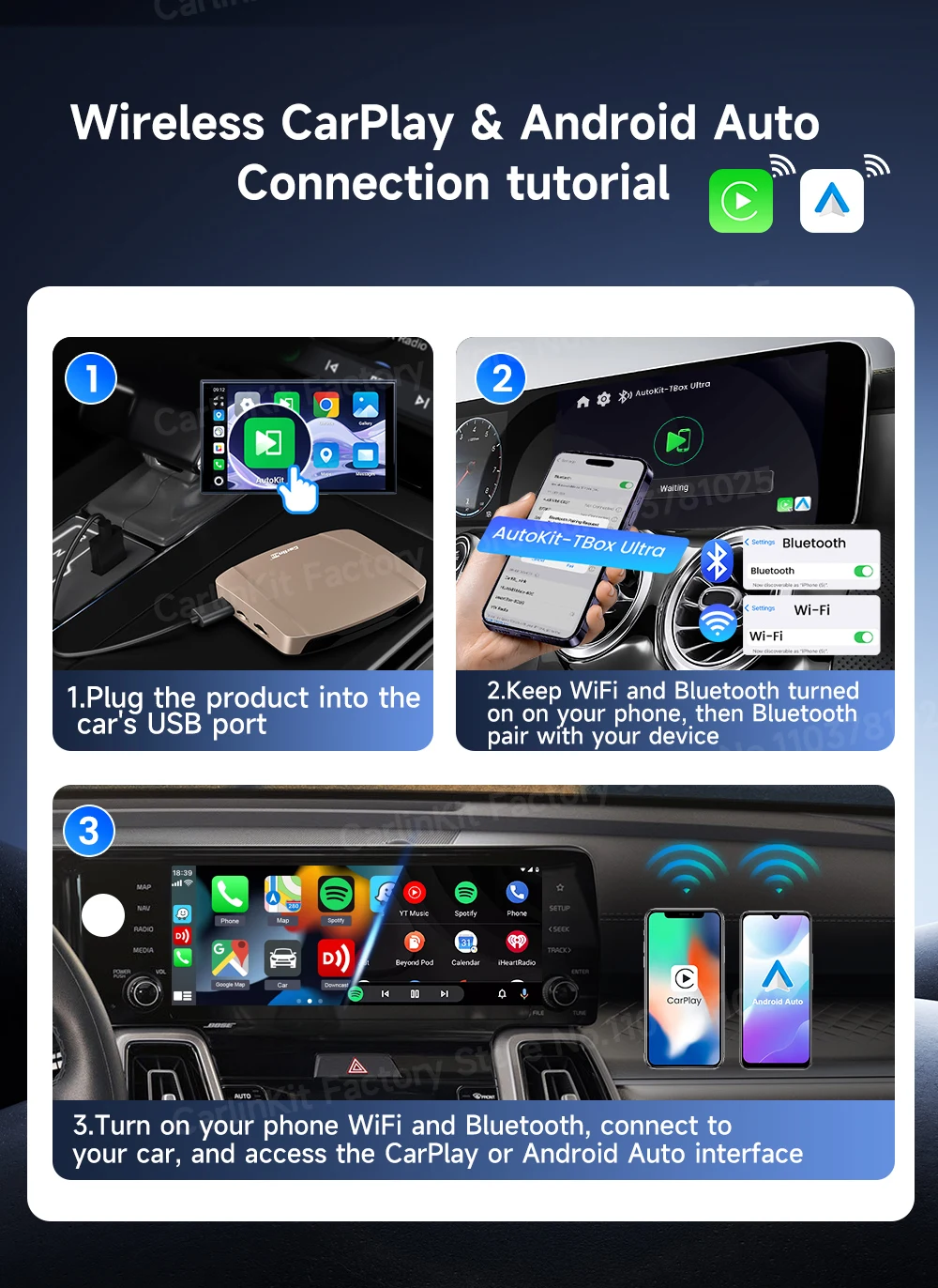 A: 純正の有線 CarPlay/Android Auto が搭載されている車載モニターに適しています。BMW 車種には対応していません。