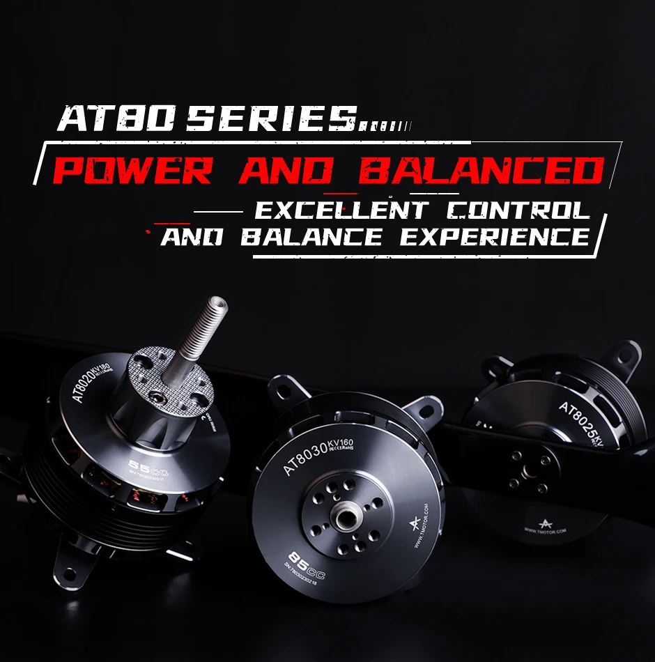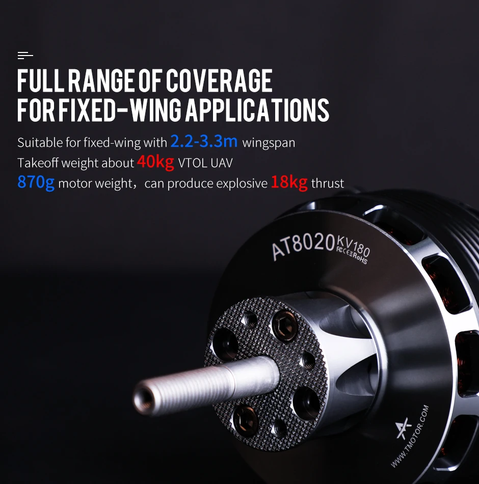 AT8020は、翼幅2.2~3.3m、離陸重量約40kgのVTOL UAV固定翼機に適したハイエンドモーターです。870gの重量ながら、最大18kgの推力を発生させます。最大出力は5500Wです。10-12sおよびAT195A ESCに適しています。