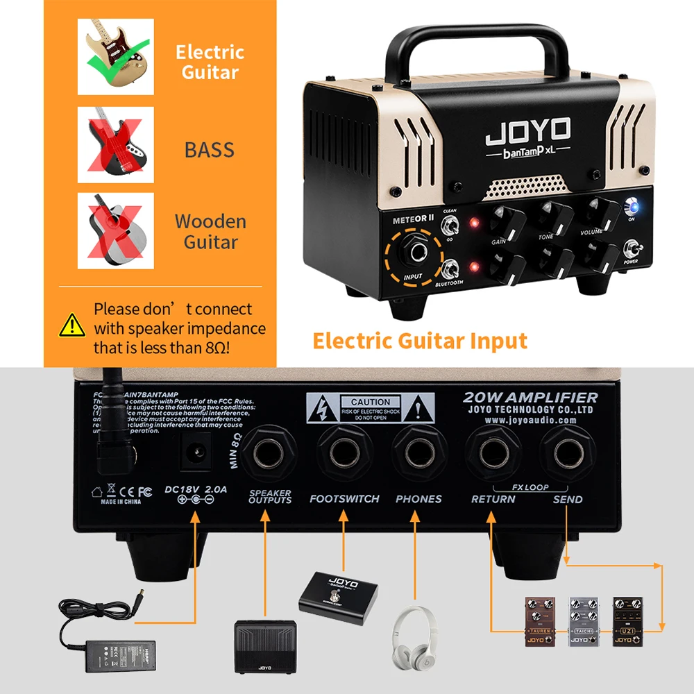 JOYO ZOMBIE IIは、お客様からの建設的なフィードバックに基づいてBanTampシリーズを最適化しました。オリジナルのトーンと機能を維持しながら、チャンネル切り替えフットスイッチ、6つのノブを搭載しています。具体的には、2つのチャンネルを個別に制御でき、CLEANチャンネルとDISTORTIONチャンネルのボリューム、さらにGAINとTONEも個別に調整できます。 サウンドは、トーンステージを豊かにすることに焦点を当てており、ギター本来のトーンを忠実に再現します。アンプは8Ωのスピーカー出力を持ち、16Ωでも動作可能です。注意:アンプは小さいですが、20ワットは十分な音量で、かなりのパワーを発揮します。大型アンプと同等の素晴らしいトーンが得られます。このアンプを使い始めると、そのサイズや価格をすぐに忘れてしまうでしょう。まるでより大きなヘッドで演奏しているかのように感じられ、友人たちはあなたのサウンドがどこから来ているのか信じられないでしょう。Bluetooth接続により無限の喜びをもたらします。さらに、BLUETOOTH接続は、BLUETOOTH対応デバイスと簡単に接続し、BantamPを通して音楽を再生できます。これは、PlayAlongsでの練習、曲の学習、伴奏の再生、ルーパー、そして自分自身を楽しむのに最適です。JOYO Bantamp XLシリーズ METEOR II