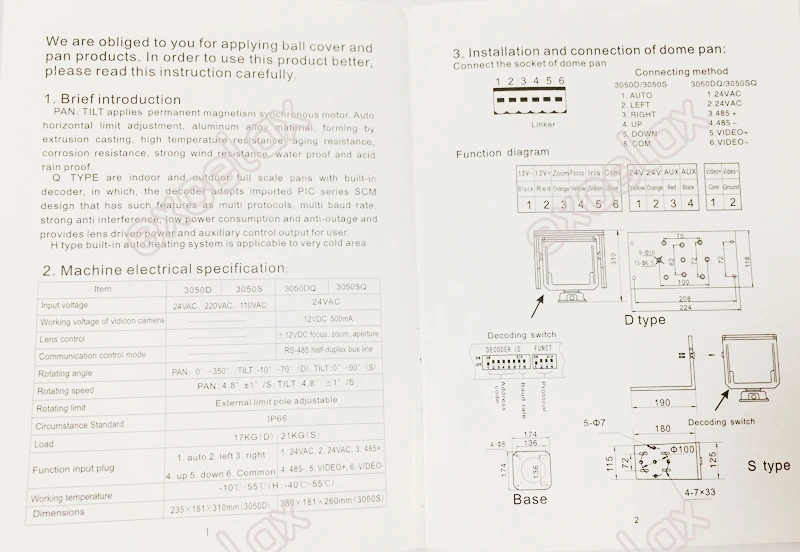 このパン/チルトスキャナーは、デコーダーを内蔵した屋内および屋外のフルスケールパンを備えています。デコーダーは、輸入されたPICシリーズSCM設計を採用し、マルチプロトコル、複数のボーレート、優れた耐干渉性、低消費電力、耐停止性などの機能を備え、ユーザーにレンズ駆動電源と補助制御出力を提供します。
