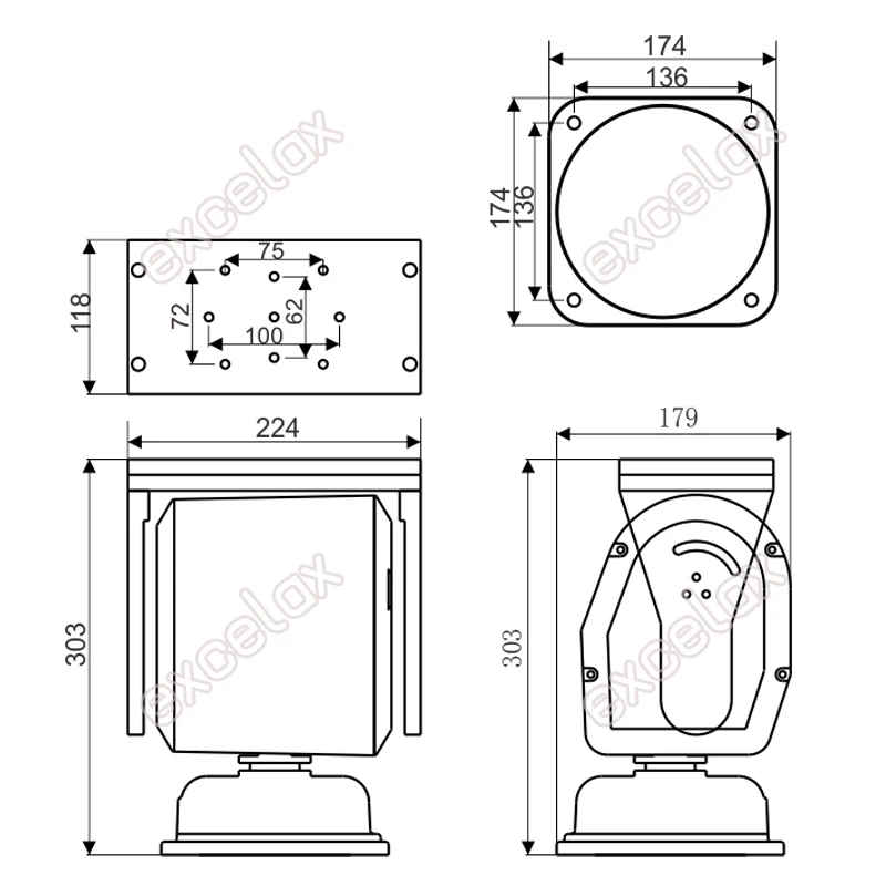 回転範囲: 水平 0 ~ 355度 (オプションで0 ~ 360度、追加料金USD15)、垂直 -70 ~ +20度