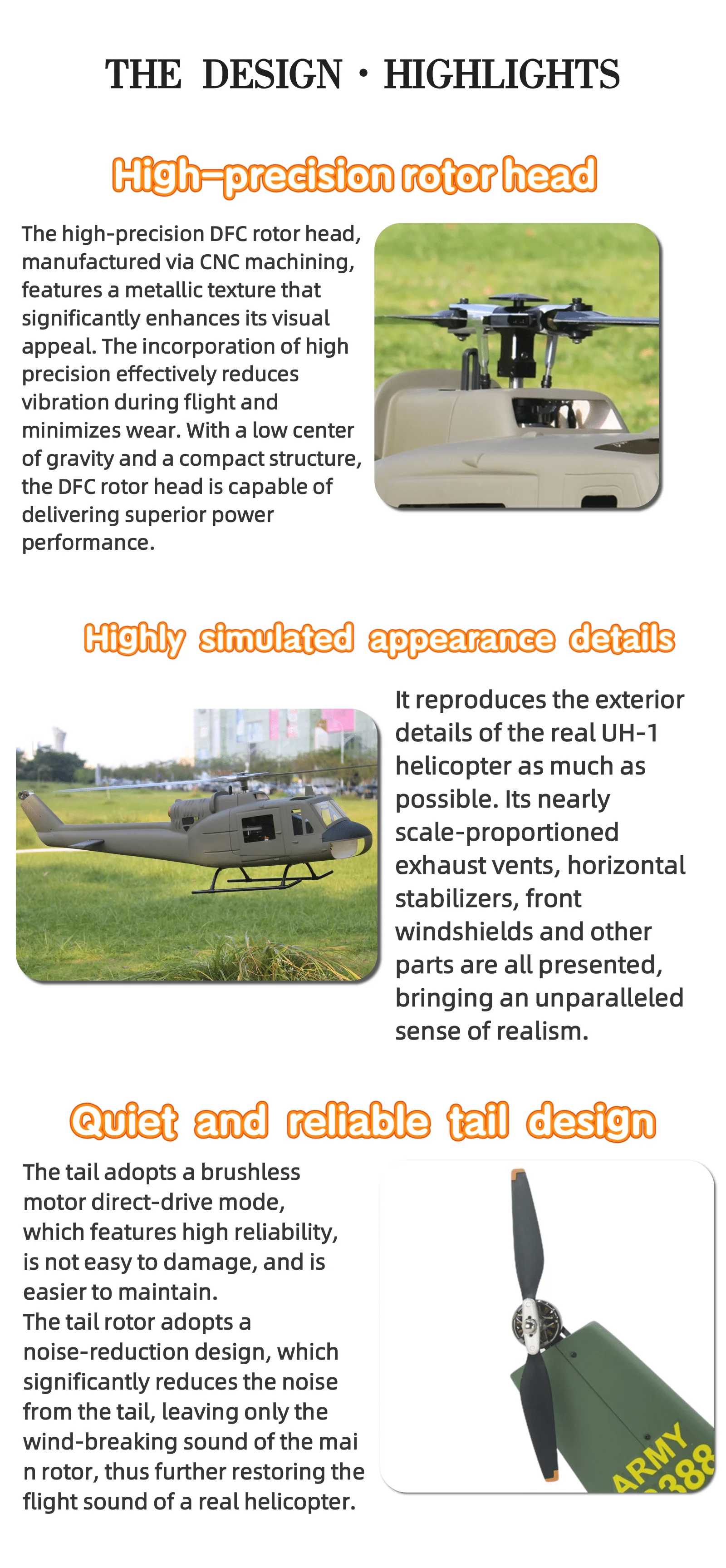 実機UH-1ヘリコプターの特徴を忠実に再現し、外観のリアリティを最大限に追求しています。