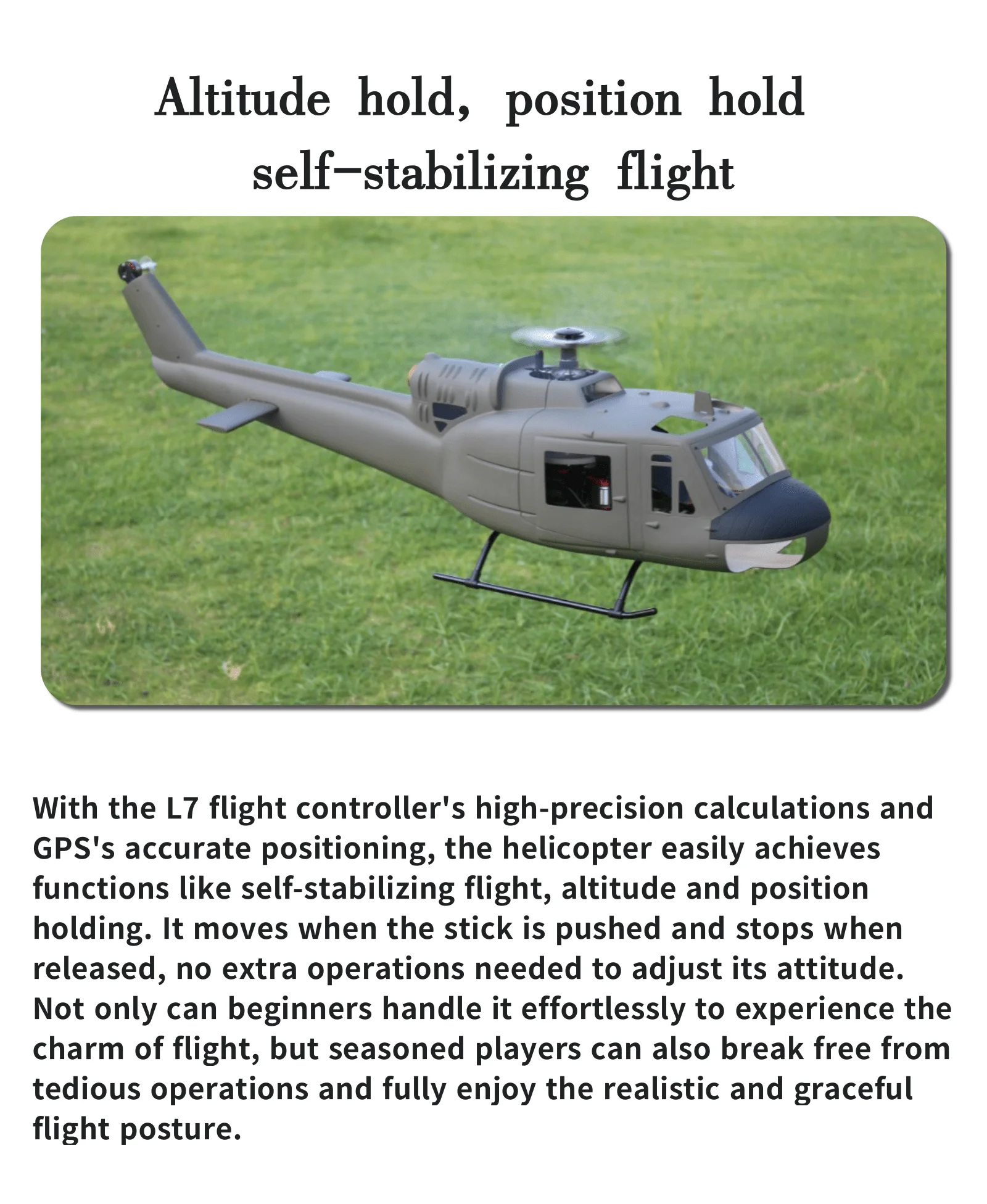 6CH GPSおよびL7フライトコントローラーが、500サイズスケールのヘリコプターにおける高精度な位置制御と安定したホバリングを実現します。