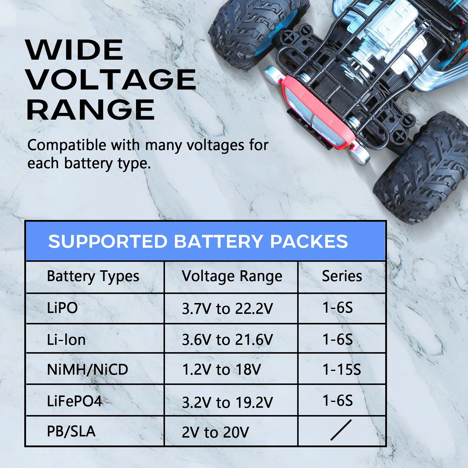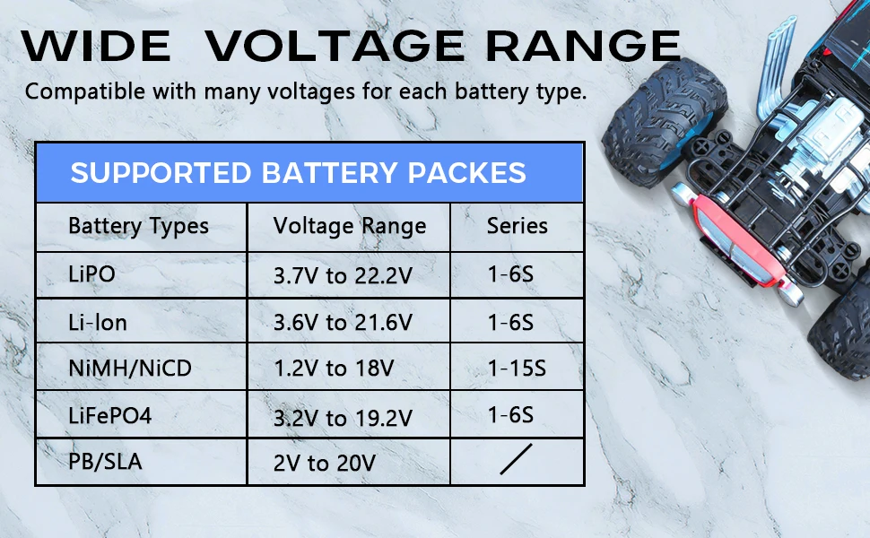 1 この充電器は、LiIon / LiPo / LiFe / NiCd / NiMh / Pbバッテリーを充電できます。