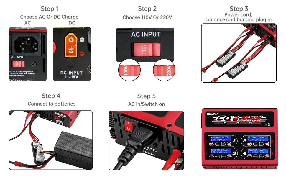 4つのバッテリーを並列に充電する場合は、このバランス充電器が必要です。この4ポートリポバッテリー充電器は、4つの異なるタイプのバッテリーを同時に充電できるため、1つのバッテリーを充電してから他のバッテリーを充電するリポバッテリー充電器には、急速充電、バランス充電、放電、ストレージ充電など、さまざまな充電機能があります。また、通常の充電ルーチンのプロファイルを保存します。特定の温度に達すると充電を停止する温度カットオフと、過電流、過電圧、漏電、短絡、逆接続保護を備えています。
