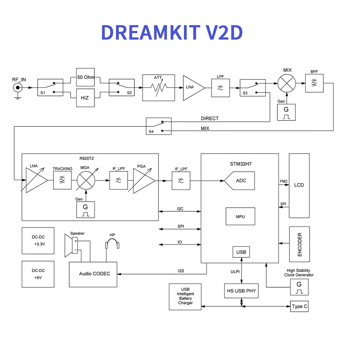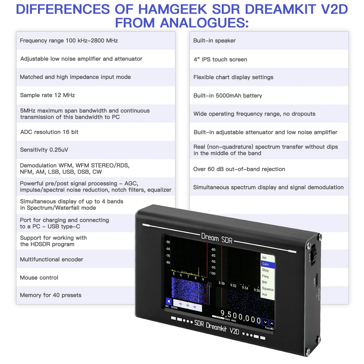 ポータブル無線受信機HAMGEEK SDR Dreamkit V2D(受信機デバイス)は、さまざまなタイプのアナログ変調で無線信号を受信、表示、および聴くように設計されています。 ディスプレイは、異なるバンドに対して最大4つのスペクトル/ウォーターフォールプロットを表示するように構成できます。 受信機はSDRテクノロジーを使用して構築されており、デバイス設定をプログラムで制御できます。 信号処理および復調ブロックは、DSPベースのマイクロコントローラで完全に作られています。 デバイスは、スタンドアロンモードとPC制御の両方で使用できます。 受信機では、内蔵スピーカーまたは有線ヘッドフォンを通して復調信号を聞くことができます。