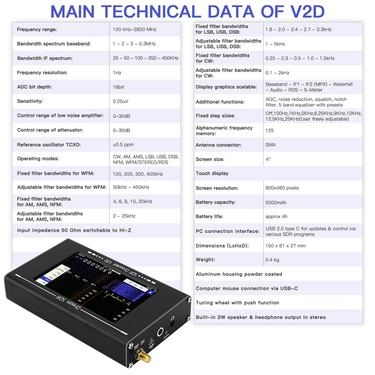 受信機は、MW / HF / VHF / UHFバンドでのアマチュア無線通信の聴取、アナログ変調送信機の調整、無線モニタリング、および無線バグの検索用に設計されています。アルミケースと内蔵バッテリーにより、実験室と実際の状況の両方で使用できます。