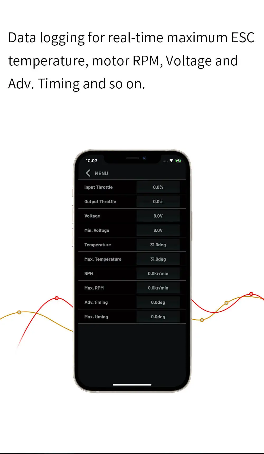 7. リアルタイムの最大 ESC 温度、モーター RPM 電圧、Adv. タイミングなどのデータ ロギング。