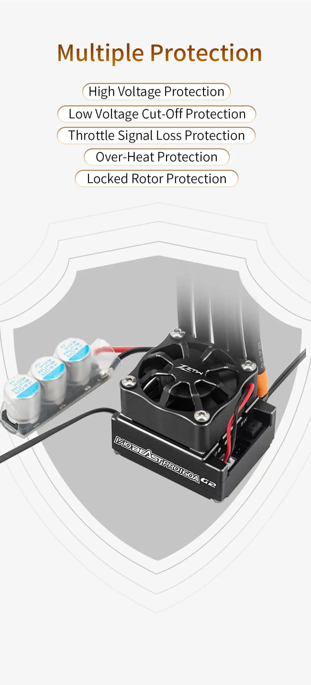 5. 複数の保護機能: 低電圧カットオフ保護、過熱保護、スロットル信号損失保護。