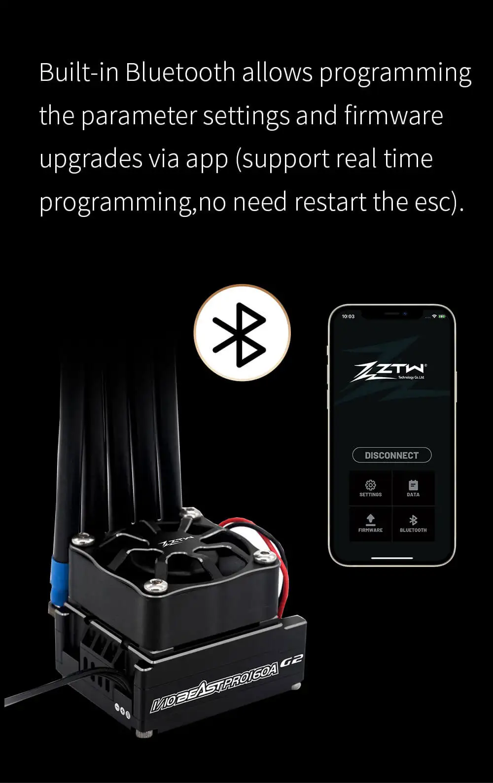 6. 内蔵 Bluetooth により、アプリを介してパラメーター設定とファームウェアのアップグレードをプログラミングできます (リアルタイムプログラミングをサポートし、ESC を再起動する必要はありません)。