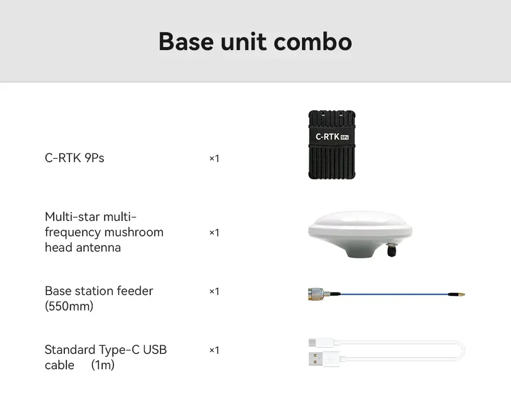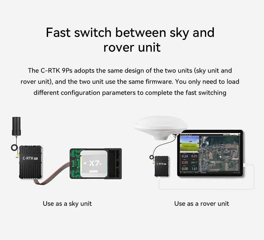 RTK(リアルタイムキネマティック)RTKは、固定基地局と移動ローバー(ドローン)を使用してGPS信号をリアルタイムで補正する技術です。これにより、測位誤差がメートルからセンチメートルに減少します。C-RTK 9Psは、NTRIPまたはローカル基地局接続を介してRTKをサポートします。PPK(ポストプロセスキネマティック)PPKは、飛行中に生のGNSSデータを記録し、ミッション後に基地局ログを使用して処理します。この方法は、RTK信号が不安定または利用できない場合に最適です。C-RTK 9Psは、高精度な生データを保存し、正確な後処理を可能にします。マルチコンステレーションサポートこのモジュールは、GPS、GLONASS、Galileo、BeiDouをサポートし、都市の峡谷や密林でも継続的な衛星カバレッジを保証します。