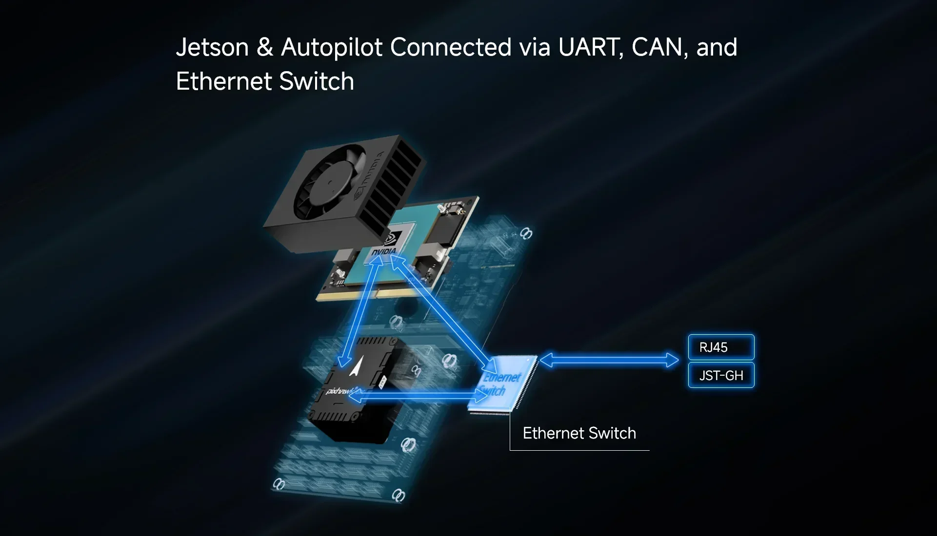 イーサネット スイッチ (RTL8367S) を介して Jetson および Autopilot の両方に接続されています
