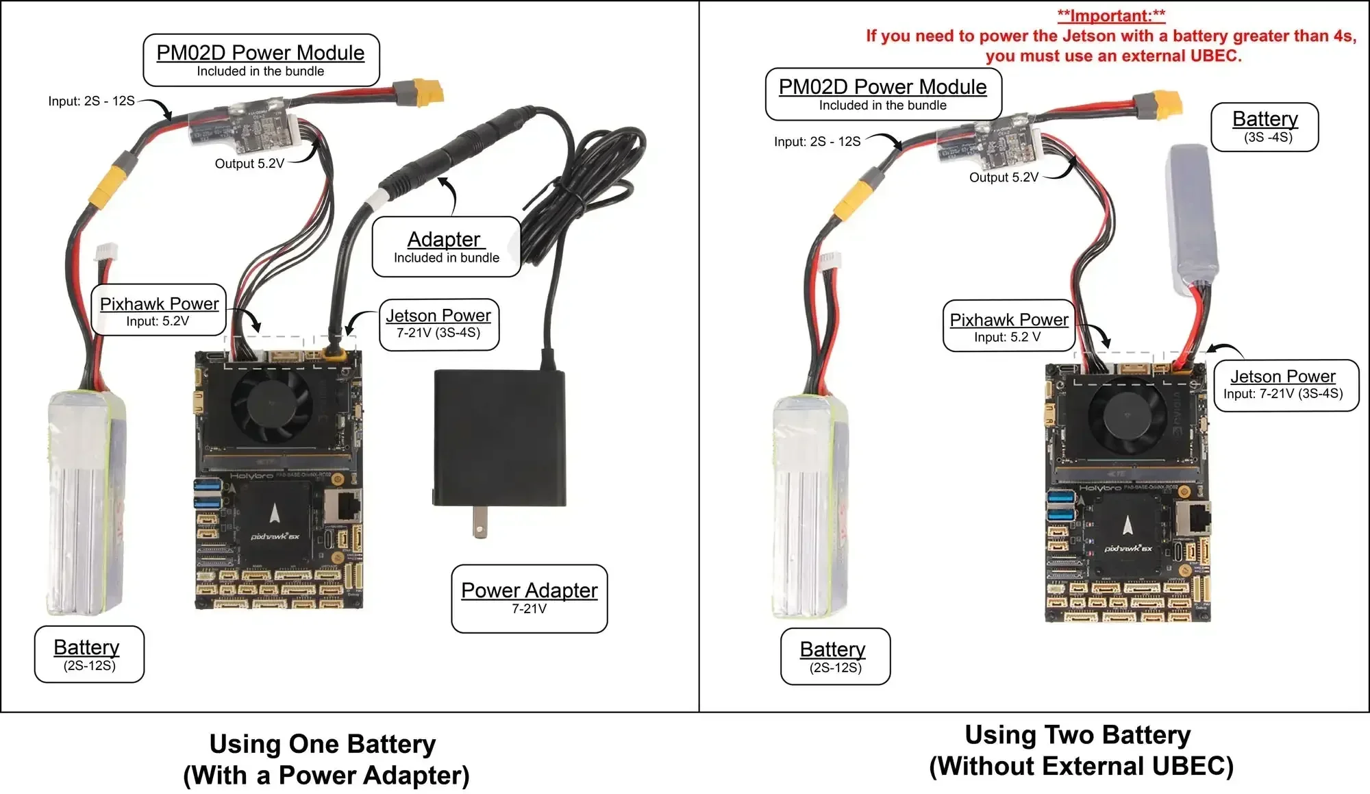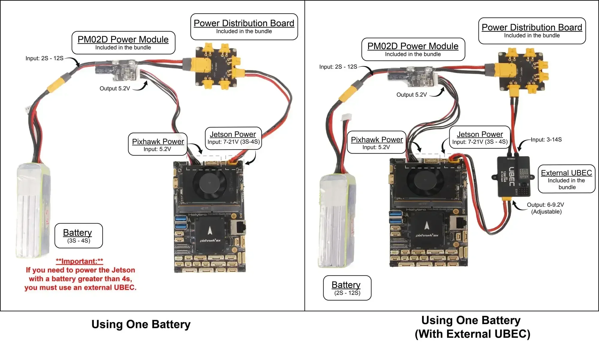 注:Pixhawk JetsonベースボードのオンボードBECは7-21V(3S-4S)のみ定格です。外部「UBEC 12A (3-14S)」を使用すると、冗長性が確保され、BEC の故障時に交換が容易になります。