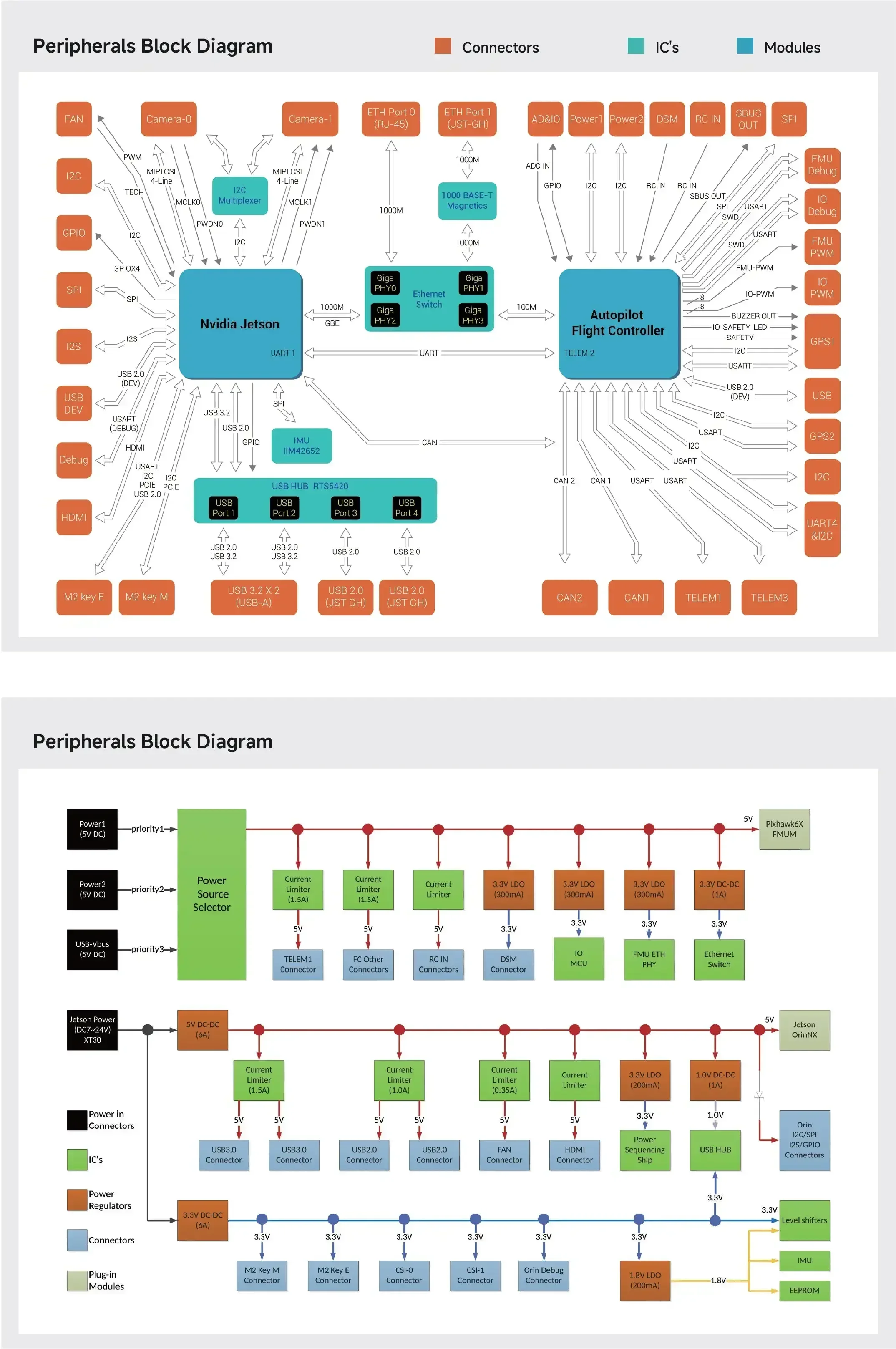 説明Holybro Pixhawk Jetson ベースボードは、Pixhawk オートパイロット バスのオープンソース仕様と NVIDIA Jetson Orin NX/Nano キャリア ボードに基づいています。Pixhawk オートパイロット バス (PAB) フォーム ファクターにより、Pixhawk 6X などの PAB フライト コントローラーで使用できます。